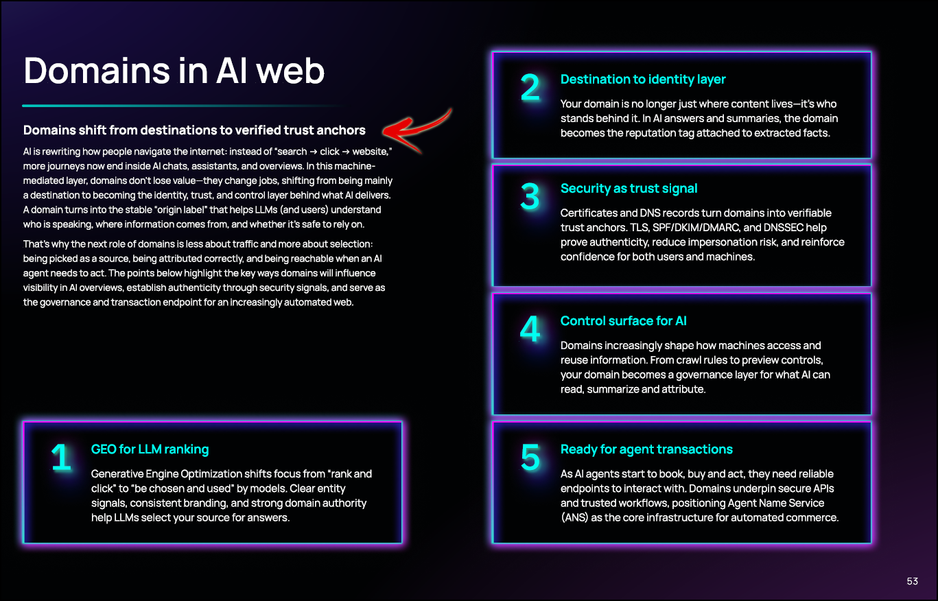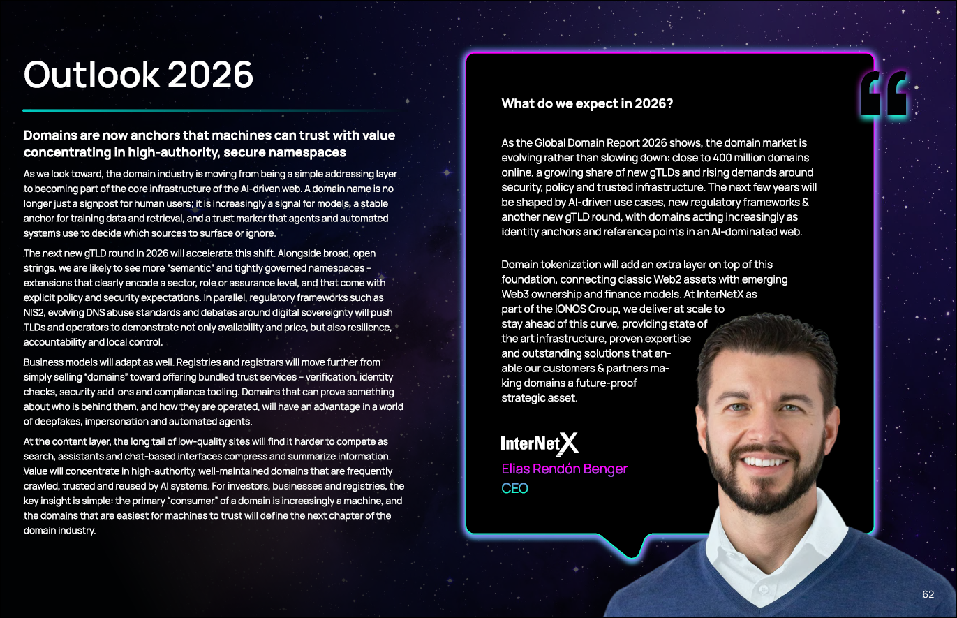 Domains are evolving from addresses into trust infrastructure. AI is accelerating domain creation, but it is also making authority, verification, and attribution far more important. The industry is not becoming less valuable – it is becoming more selective, more technical, and more strategic. Page 53 explains the mechanism, and page 62 explains the consequence.