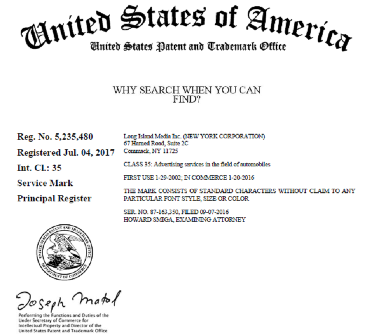 (COMMACK, NY) Cars Digital Inc., through parent company, Long Island Media, Inc. has announced the successful registration of a federal trademark WHY SEARCH WHEN YOU CAN FIND?® with the United States Patent and Trademark Office for its Find.Cars service, establishing the phrase as a catch-all motto that encompasses the spirit and drive that the nation’s premiere car searching service brings to each and every transaction since its inception in 2015. Marks on the Principal Register are granted the full benefits of the U.S. trademark laws. A descriptive Mark will only be permitted on the Principal Register if it has acquired secondary meaning (distinctiveness).