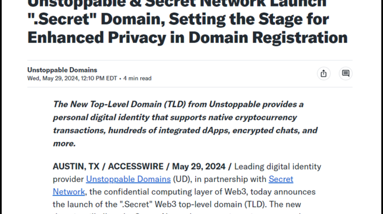 SAN FRANCISCO, CA - Digital identity provider Unstoppable Domains (UD) and Secret Network, the confidential computing layer of Web3, officially announced on Thursday, May 30 that they have launched the ".Secret" Web3 top-level domain (TLD), which will offer enhanced digital privacy and communication for users within the blockchain community. The .Secret TLD – which will function as both a web address and digital identifier – represents a huge leap in terms of privacy for … [Read more...]