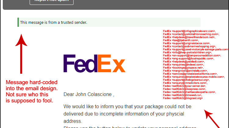 NEW YORK, NY – From time to time I like to point out some phishing scams that are out there in hopes to help some people not fall for these email-traps; today is one of those day. This email stuck out not for its sophistication but for more of its non-sophistication, and recurring delivery. For instance, I’ve received these at least 4 times in the last couple of days. This scam pictured below is trying to capture FedEx users regarding the non-delivery of their package; a … [Read more...]